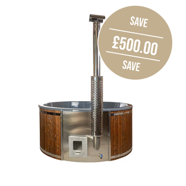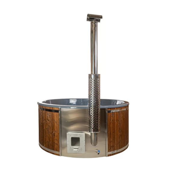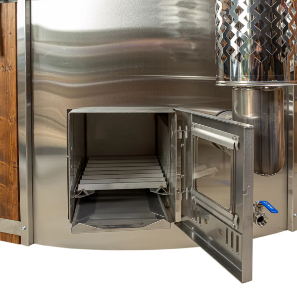 This model features a fully integrated stainless steel stove (Ansi 304, 35 kW), which is built into the tub structure—saving space around the unit and making it ideal for smaller yards or terraces. With a water capacity of 800 liters, the Elite tub heats up quickly: approximately 1.5 hours in summer and 2.5 hours in winter, using softwood or hardwood fuel.