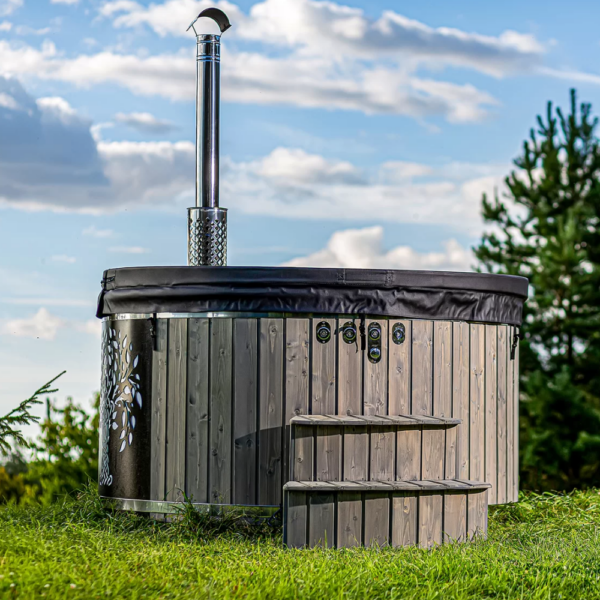 The 200 cm (78.7 inches) diameter offers a compact yet comfortable soaking experience, with an 85 cm (33.5 inches) depth and a chimney height of 255 cm (100.4 inches) including a heat guard and rain cowl for safety. Steps are included for easy access.
