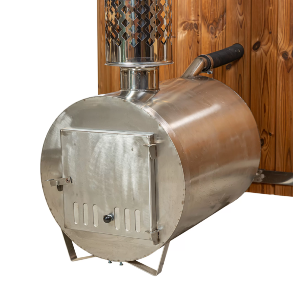 This model features an external square stainless steel stove (Ansi 304, 22 KW, 50 cm), allowing more internal seating space and convenient fuel access. With a 1000-liter capacity, it offers a deep, immersive soaking experience while remaining easy to heat – 1.5 hours in summer, 2.5 hours in winter with firewood.